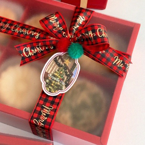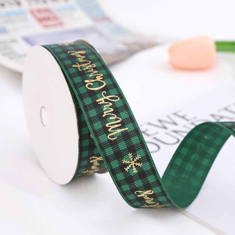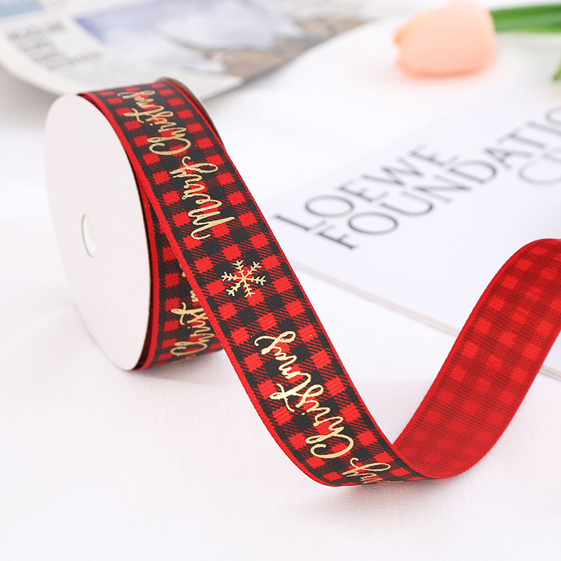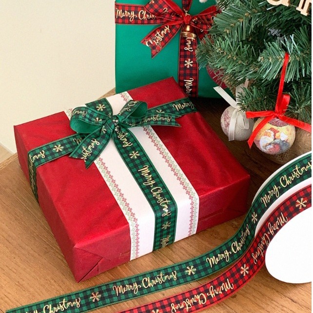 ริบบิ้นผ้าลายสก็อตธีมคริสต์มาส สกรีนทอง Merry Chrismas กว้าง 2 cm (ยาว 25 หลา)